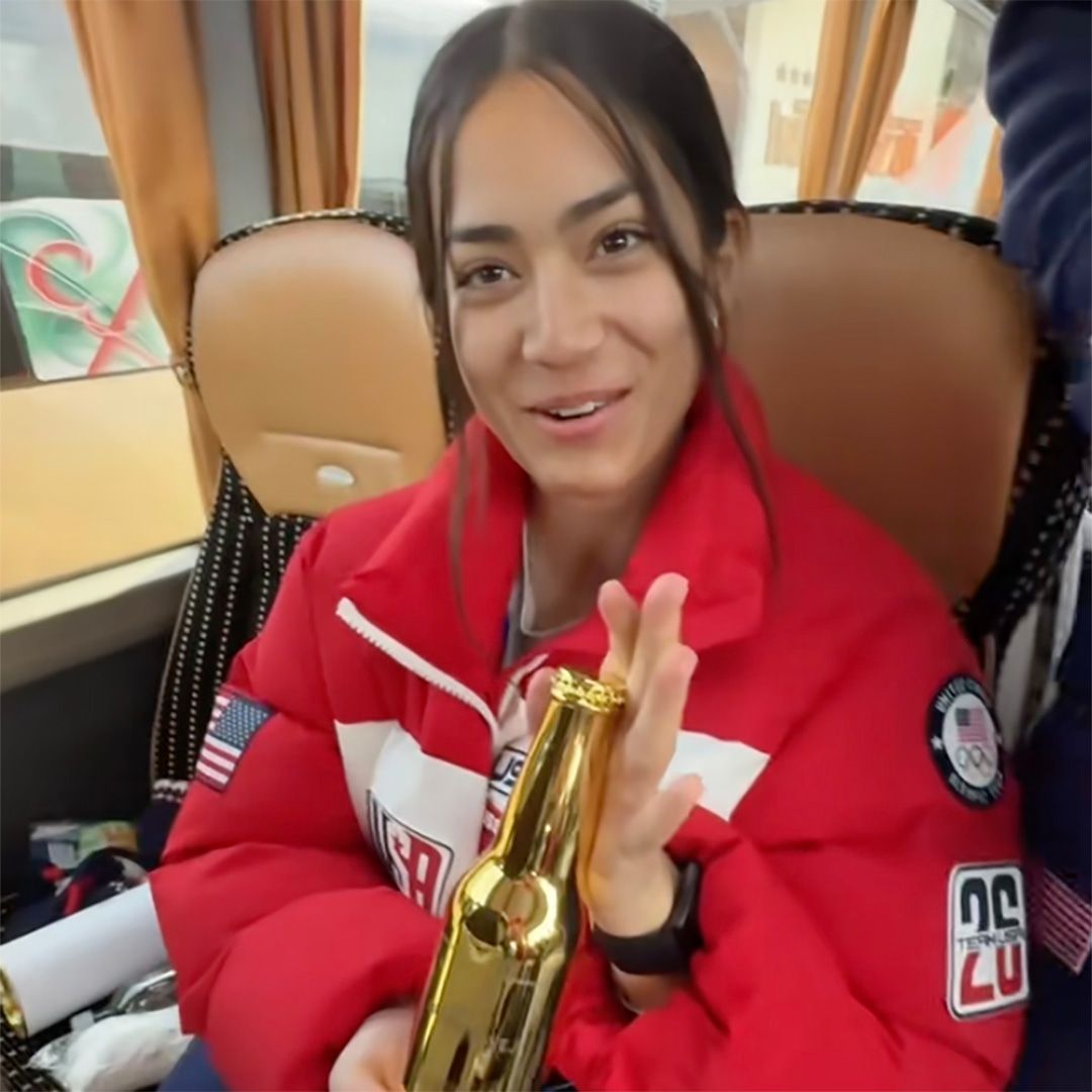 Sciatore magnate di freestyle Olivia Giaccio Successivamente, mostrando i vari tubi per il trucco che si è infilata nelle tasche.