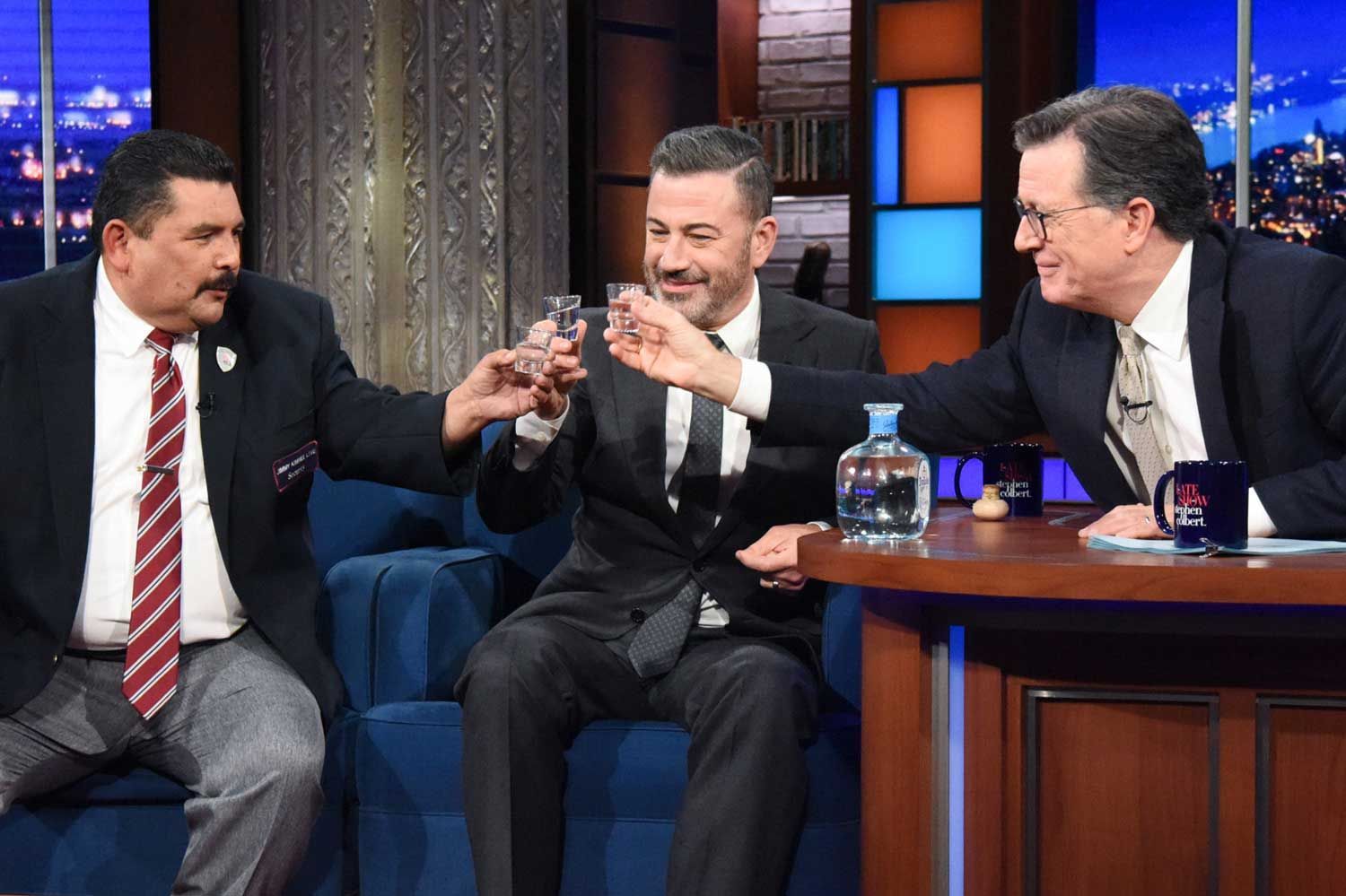 Una notte in cui Kimmel non era solo nello spettacolo di Calbert, era presente anche Colbart Jimmy Kimmel LiveChe sta girando temporaneamente nella posizione a Brooklyn, New York, due padroni di casa Lo spettacolo tardivo La ABC è stata restituita dal set di Kimel a un suo video.