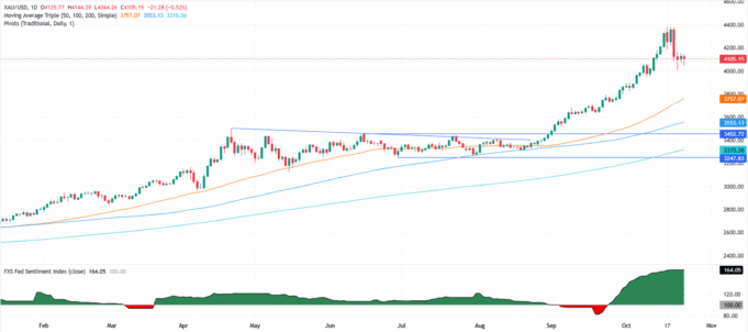 Il trend rialzista del prezzo dell’oro rimane intatto nonostante abbia toccato un minimo intraday inferiore a 4.100 dollari, mentre la coppia XAU/USD è scesa sotto la SMA (media mobile semplice) a 20 giorni di 4.056 dollari. Il Relative Strength Index (RSI) mostra che lo slancio rialzista continua, ma gli acquirenti devono superare un livello di resistenza chiave prima di spingere i prezzi dell’oro al rialzo.