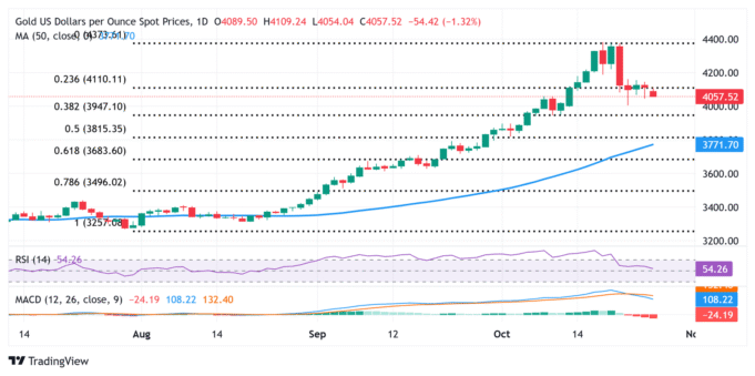 Da un punto di vista tecnico, la materia prima sembra aver trovato accettazione al di sotto del livello di ritracciamento di Fibonacci del 23,6% del rally di luglio-ottobre. Tuttavia, il rimbalzo della scorsa settimana da vicino al livello psicologico di $ 4.000 e gli oscillatori contrastanti sul grafico giornaliero danno motivo di cautela agli orsi XAU/USD. Ciò a sua volta suggerisce che un ulteriore calo al di sotto del minimo di venerdì, attorno all’area dei 4.044 dollari, potrebbe continuare ad attrarre alcuni acquirenti vicino a detto livello. Questo è seguito dal Fibonacci del 38,2%. Livello di ritracciamento intorno a 3.948 dollari, che se rotto in modo deciso potrebbe spingere i prezzi dell’oro a livelli inferiori a 3.900 dollari. Alcune vendite successive dovrebbero aprire la strada a un calo verso il livello di ritracciamento del 50%, approssimativamente nell’area 3.810$-3.800$, in rotta verso la SMA (media mobile semplice) a 50 giorni, attualmente vicino all’area 3.775$.