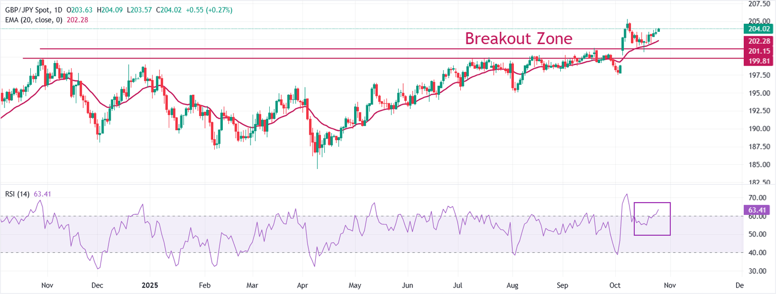 Lunedì la coppia GBP/JPY ha toccato un nuovo massimo di due settimane vicino a 204,00, scambiando in rialzo dello 0,25% durante la prima sessione europea. La coppia valutaria si sta rafforzando poiché lo yen giapponese (JPY) sottoperforma i suoi pari mentre il neoeletto Primo Ministro giapponese Sanae Takaichi si impegna ad aumentare la spesa per la difesa e si prevede che annunci piani di bilancio più elevati nel suo prossimo bilancio.