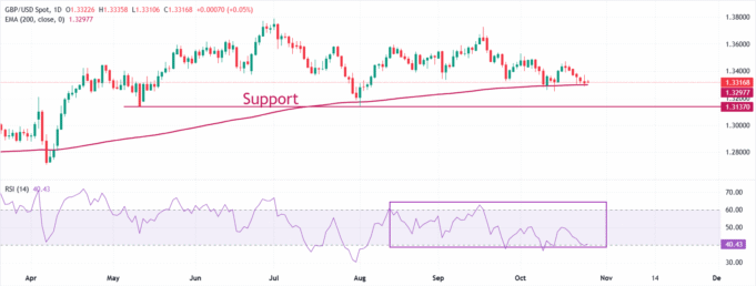 Lunedì la sterlina sta lottando per guadagnare terreno contro il dollaro USA, vicino ai minimi di 12 giorni intorno a 1,3310. La tendenza generale della coppia GBP/USD è incerta poiché fluttua vicino alla media mobile esponenziale (EMA) a 200 giorni, scambiando intorno a 1,3300.