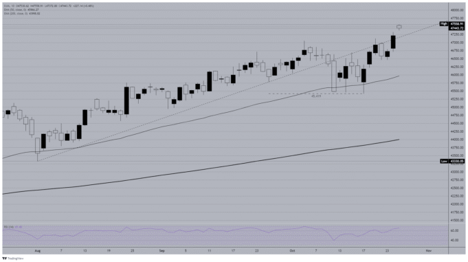Il Dow Jones Industrial Average (DJIA) è salito a un nuovo massimo storico nelle prime contrattazioni di lunedì, superando per la prima volta in assoluto quota 47.500, mentre il sentiment degli investitori continuava a riprendersi. I mercati scommettono che un altro accordo commerciale dell’ultimo minuto tra Stati Uniti e Cina eviterà il peggio delle minacciate tariffe del presidente Donald Trump.