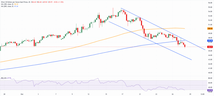 L’argento rimane sotto pressione e continua la correzione all’interno di un canale discendente visibile sul grafico a 4 ore che è in atto dal massimo di 54,68 dollari. Lo slancio ribassista ha spinto il metallo al di sotto delle medie mobili semplici (SMA) a 100 e 200 periodi nello stesso periodo, rafforzando l’orientamento negativo a breve termine.