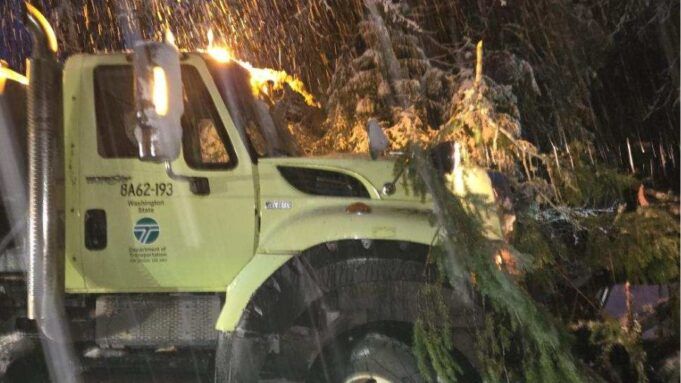 Uno spazzaneve del Dipartimento dei trasporti dello Stato di Washington (WSDOT) è stato colpito da un albero caduto venerdì mattina mentre gli equipaggi stavano lavorando lungo la US Highway 2 a est di Skykomish.