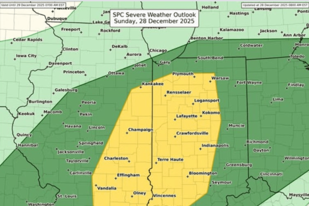 Lo Storm Prediction Center (SPC) ha classificato Illinois, Indiana, Michigan meridionale e Ohio nordoccidentale a un rischio di tempesta grave di livello da 1 a livello 2, rilevando che venti dannosi e tornado isolati erano possibili, soprattutto quando l’aria calda e instabile si scontrava con venti settentrionali più freddi.