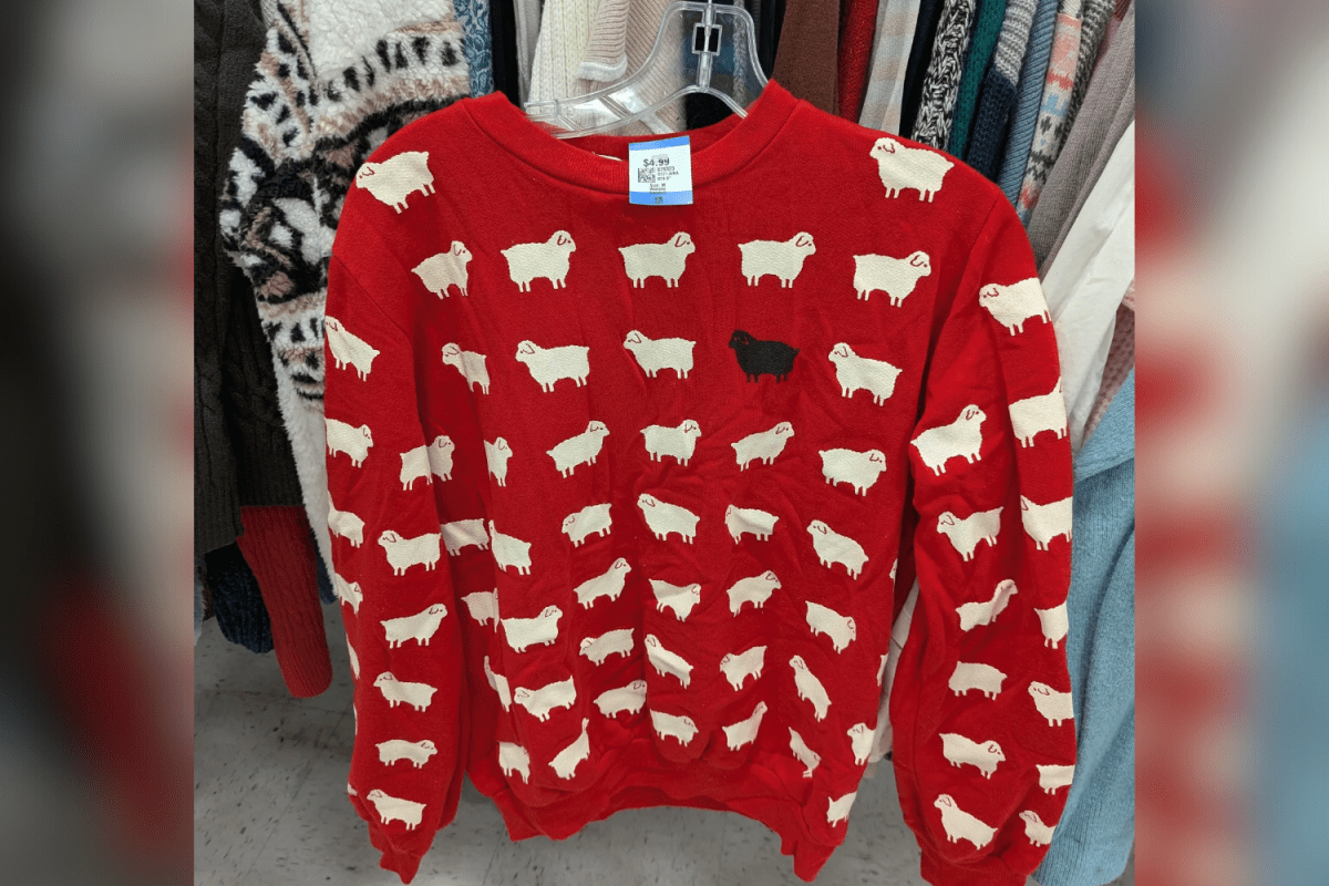 Jane Labovitch dice di aver trovato un maglione rosso brillante con una stampa di pecore bianche mentre curiosava tra gli scaffali di un negozio dell’usato sulla 2nd Avenue a Columbia, nel Maryland. Il prezzo? Solo $ 4,99.