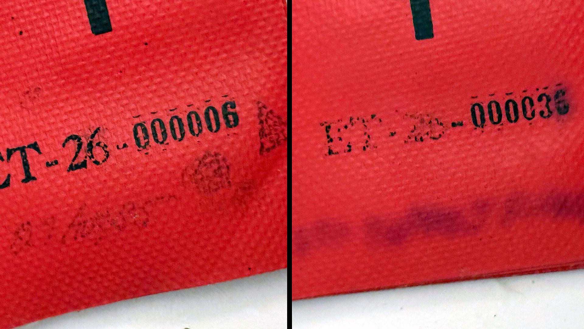 Un dettaglio ravvicinato dell’etichetta “restituzione prima del volo” su due delle 18 navette acquistate su eBay. Tutti erano contrassegnati come “ET-26” con un numero di serie. Include alcuni timbri aggiuntivi e annotazioni scritte a mano. Sebbene gran parte di quest’ultimo sia penetrato nel tessuto a tal punto da non essere più leggibile.