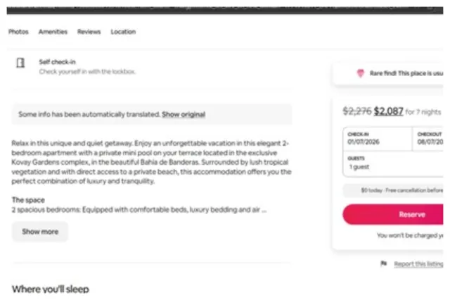 Un annuncio di Airbnb pubblicizza “un elegante appartamento con 2 camere da letto con mini piscina privata” nell'”esclusivo complesso Kovay Garden”.