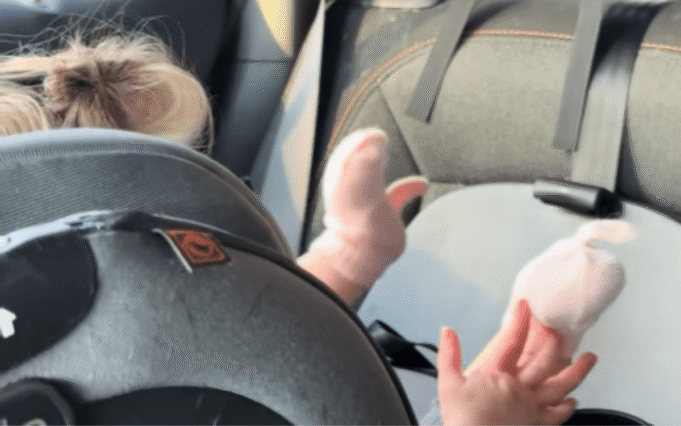 Il video mostra sua figlia Dale seduta sul seggiolino dell’auto con un paio di guanti ai piedi al posto dei calzini. La clip è diventata virale, raccogliendo oltre un milione di visualizzazioni.