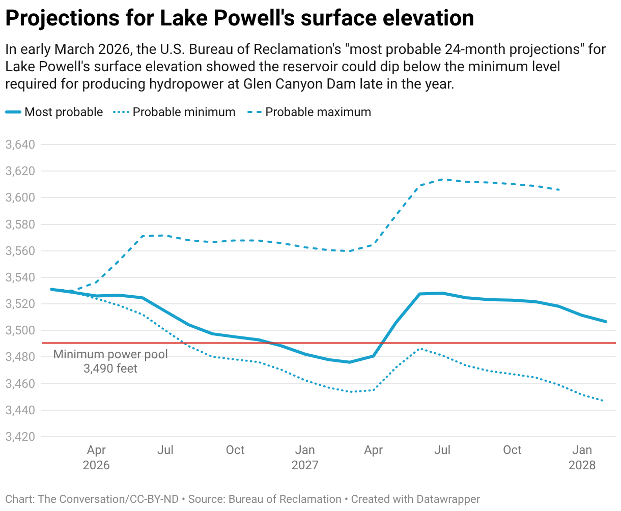 Nel bacino del fiume Colorado, La previsione più probabile del Bureau of Reclamation degli Stati Uniti Nel dicembre 2026 il livello dell’acqua nel lago Powell ha indicato un calo al di sotto dell’elevazione minima della piscina elettrica. Questa è una brutta notizia per gli alimentatori, perché al di sotto di quel livello, la diga del Glen Canyon Non è possibile generare energia idroelettrica. La diga fornisce energia a milioni di clienti In sette stati.