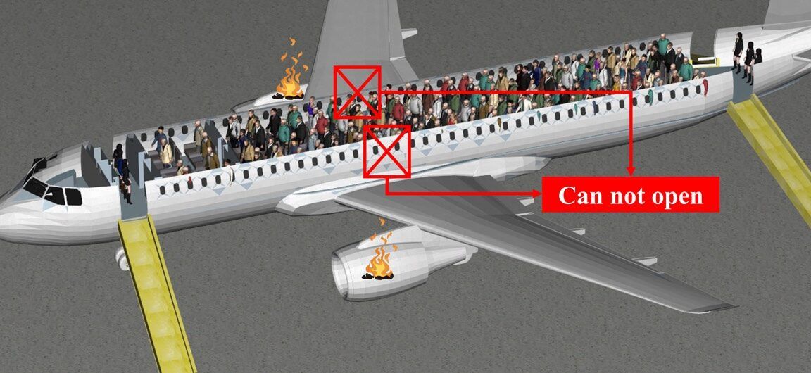Zhang et al. Create due categorie di passeggeri: gli anziani di età pari o superiore a 60 anni e quelli sotto i 60 anni. Hanno modellato tre diverse proporzioni di queste due categorie: scenari di evacuazione dominati dai giovani, equamente bilanciati e dominati dagli anziani, per catturare dinamiche di viaggio più realistiche ed escludere casi limite (ad esempio, scenari di tutti non anziani o tutti anziani). Per ciascuno di essi, il modello prevedeva tre distinti modelli di posti a sedere: uno in cui i passeggeri più anziani sono equamente distribuiti nell’area vicino all’uscita; una dove gli anziani erano concentrati al centro della cabina, lontano dalle uscite; e uno in cui i passeggeri anziani venivano distribuiti casualmente in tutta la cabina.