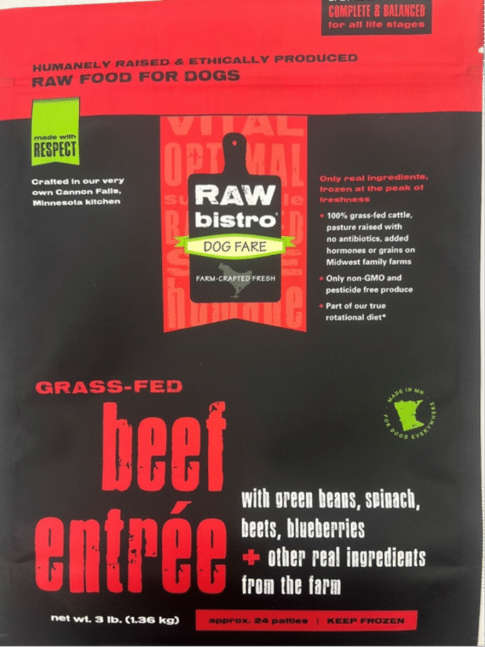 - Raw Bistro Doug Rent Ferry Beef Entry, sacchetto congelato da 3 libbre (UPC 85833002247) lotto 239, da consumarsi preferibilmente il 27/08/2026.
