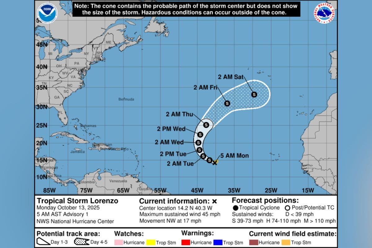 L’NHC ha dichiarato che il vento più persistente è stato di 45 miglia all’ora con uno strappo maggiore e afferma che l’aria con forza di tempesta tropicale si è estesa per 90 miglia dal centro di Lorenzo.