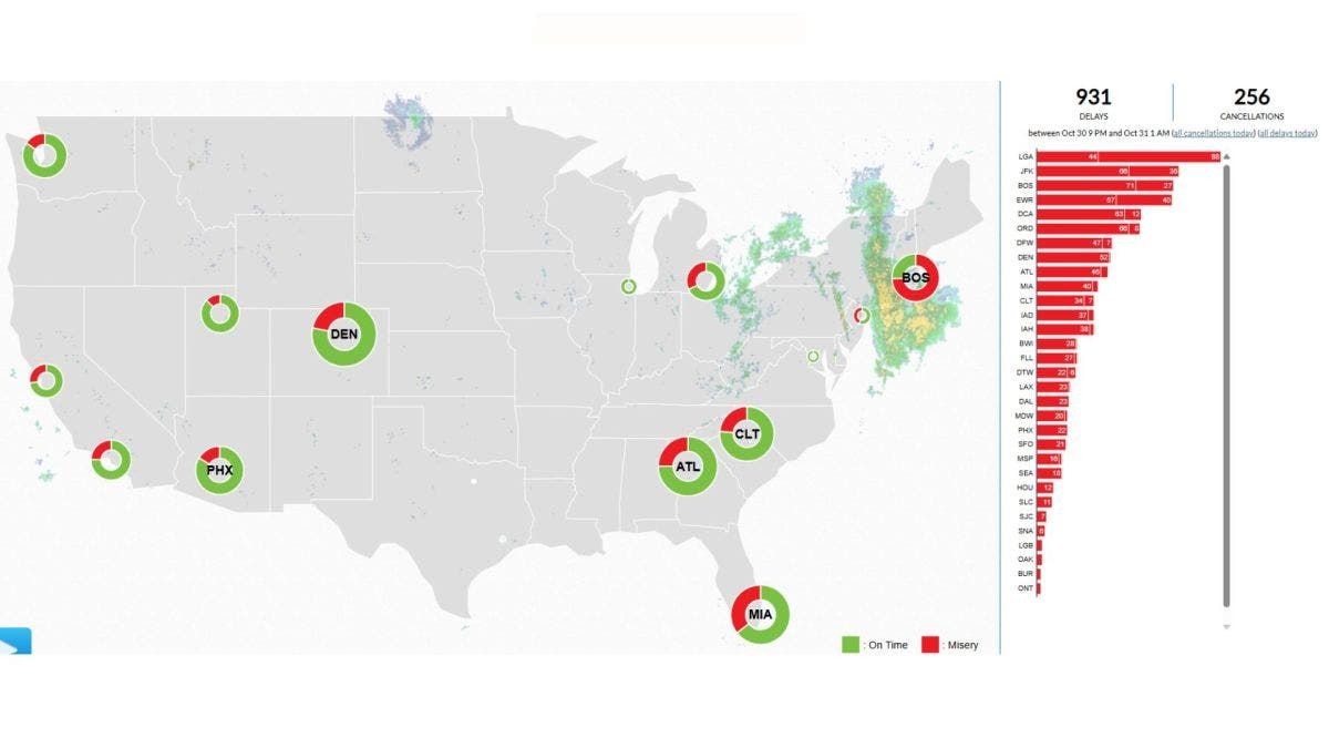 Alle 4:00 ET, ci sono stati solo 30 ritardi con 2 cancellazioni, ma alle 9:00 ET quel numero era 344, con 16 cancellazioni.