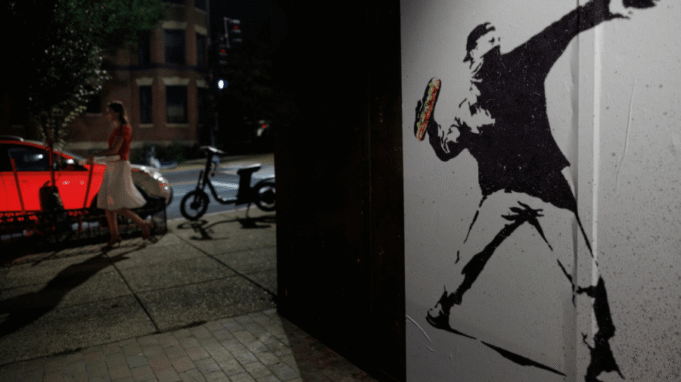 Arte in stile Banksyraffiguratolancio del panino,segno di protestaImmagine sandwich e conMerceDalle magliette agli adesivi sul mercato online Etsy ha dominato il momento al centro del procedimento penale di Dunn.