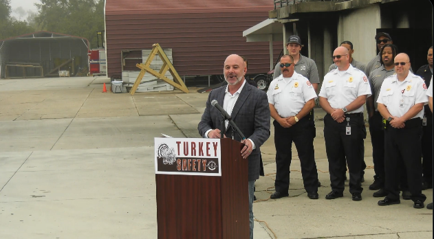 Responsabile Affari Finanziari e Capo dei Vigili del Fuoco Blaise Ingoglia Istruisce gli abitanti della Florida sui dettagli più delicati della sicurezza antincendio quando si tratta di arrostire un tacchino.