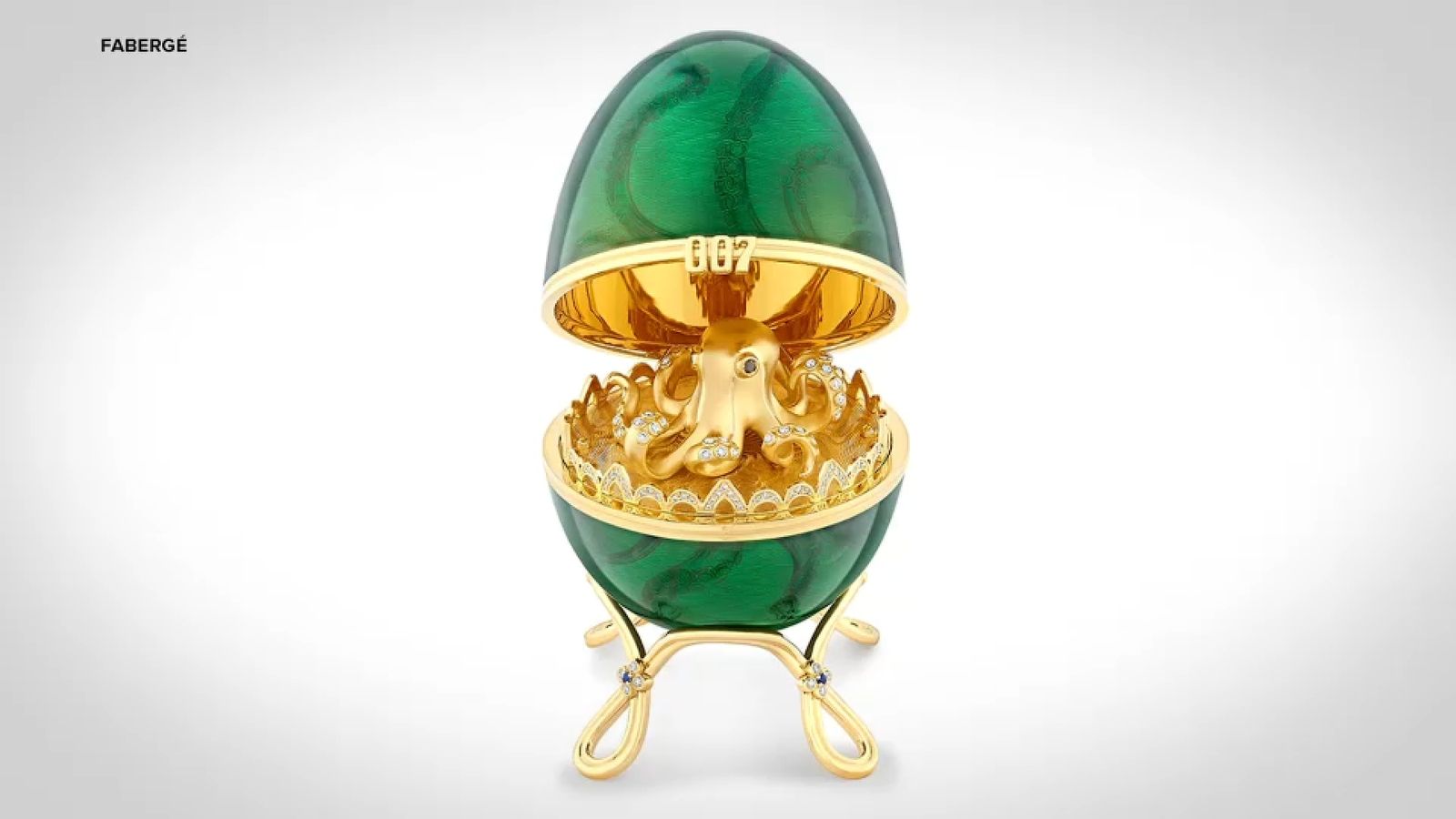 “Una volta aperto, l’uovo rivela un polipo in oro giallo 18 carati ornato con ventose di diamanti bianchi e occhi di diamanti neri”, si legge nella descrizione del prodotto. “Il twist del polpo rende omaggio all’omonimo antagonista al centro del film Octopussy.”