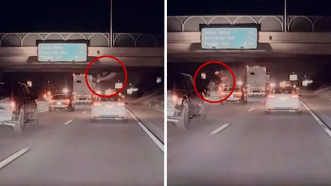 Il video mostra il camioncino che vola da un cavalcavia vicino all’uscita Ayala Drive a Rialto e atterra su un SUV sulla superstrada 210 sottostante. L’incidente è avvenuto venerdì intorno alle 18.30.