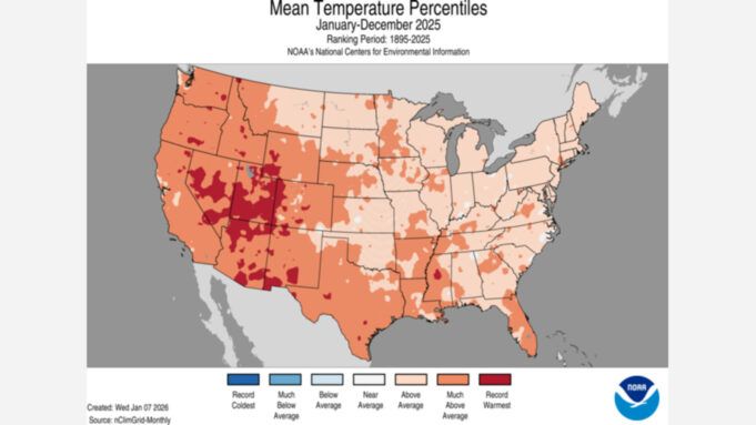La NOAA evidenzia il 2025 come il quarto anno più caldo mai registrato per gli Stati Uniti contigui nel suo rapporto nazionale sul clima. La temperatura media annuale era di 54,6 (F). Questo è 2,6 (F) superiore alla media del 20° secolo.
