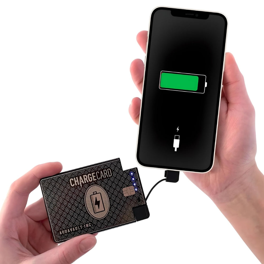 Mantieni i tuoi dispositivi carichi mentre sei in movimento con AquaVault ChargeCards. Questi caricabatterie ultrasottili e compatti stanno nel tuo portafoglio per avere sempre energia quando ne hai bisogno. Scegli una versione cablata con cavi integrati per iPhone e Android o un modello wireless che si collega ai telefoni più recenti senza cavo.
