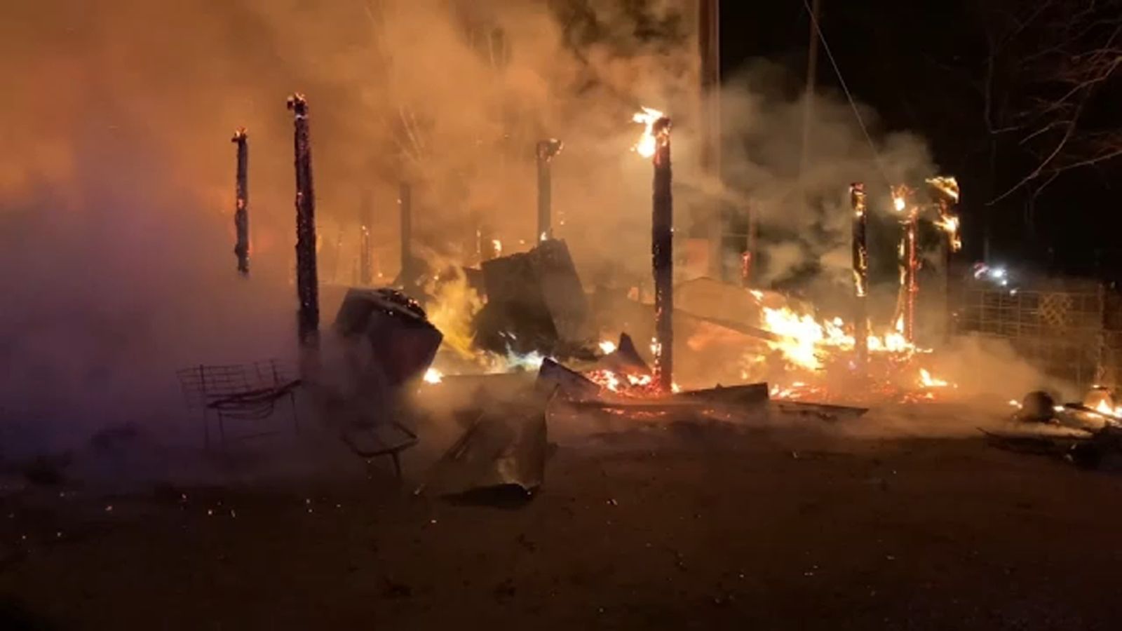 L'edificio crolla dopo l'incendio in un'azienda di allevamento di cani nella contea di Sampson