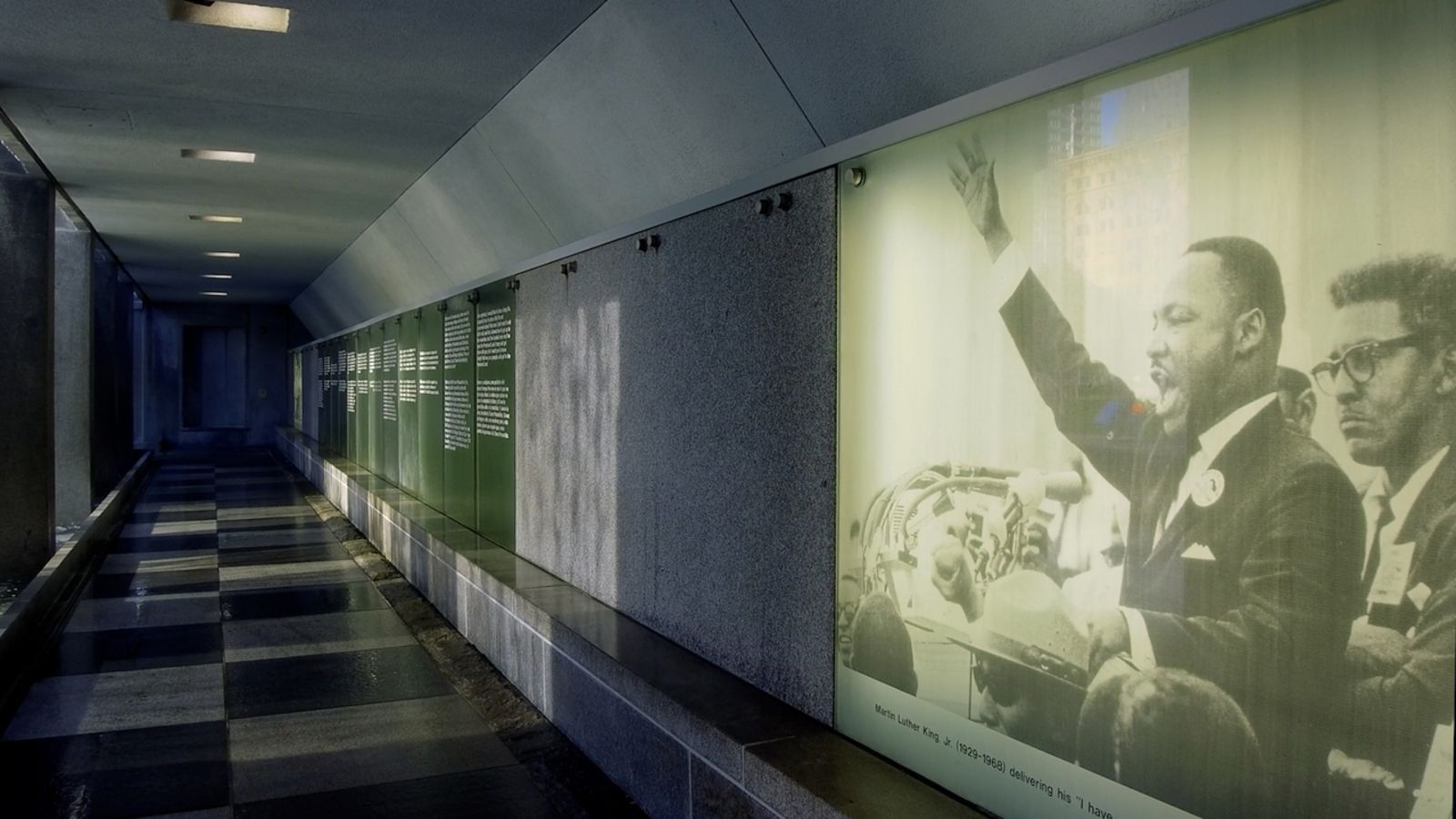 All’interno della passerella con cascata si possono leggere toccanti citazioni dei discorsi di Martin Luther King Jr. incise su pannelli di vetro e tradotte in diverse lingue.
