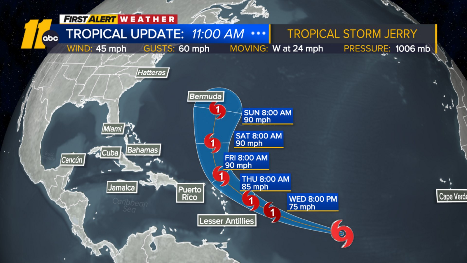 La tempesta tropicale Jerry dovrebbe diventare il primo uragano di categoria nei prossimi giorni.