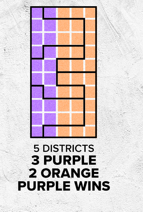 Tuttavia, quando i confini vengono ridisegnati, come mostrato dall’estrema destra, gli elettori viola possono ottenere la maggioranza nonostante siano in inferiorità numerica.