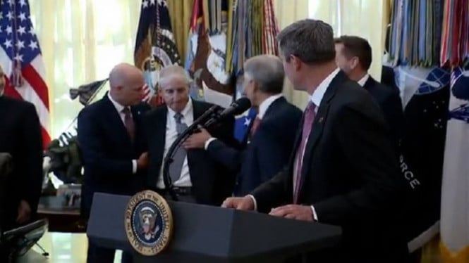 Il presidente degli Stati Uniti Donald Trump osserva un uomo che crolla durante una conferenza stampa nello Studio Ovale