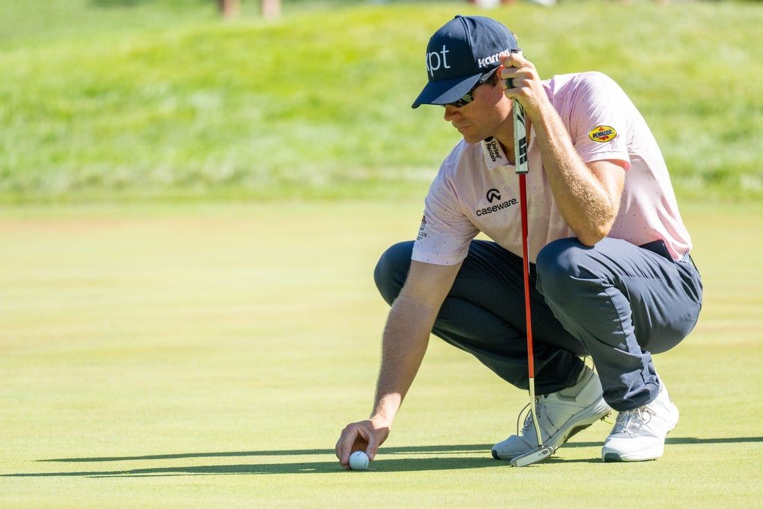 3 luglio 2025; Silvis, Illinois, Stati Uniti; Adam Schenk allinea il suo tiro sul nono green durante il primo round del torneo di golf John Deere Classic. Credito obbligatorio: Marc Lebryk-Imagn Images
