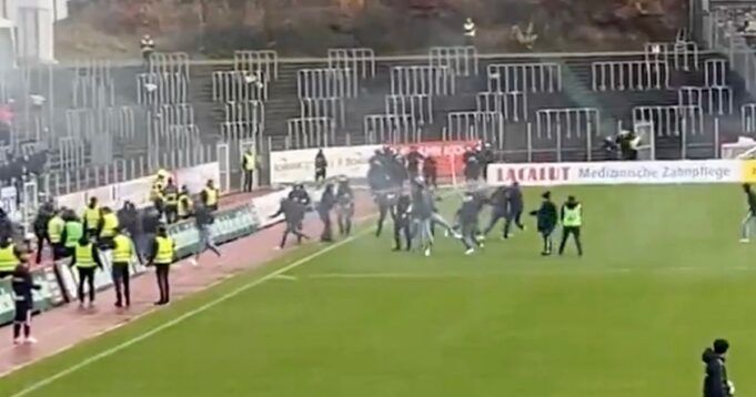 Gli hooligan del calcio si sono scontrati durante uno scontro della lega inferiore in Germania dopo che un gruppo di tifosi ha rubato la bandiera del loro rivale e l’ha bruciata, provocando l’intervento della polizia.