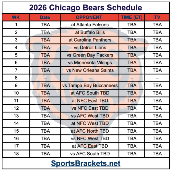 Un programma stampabile è uno dei modi più semplici per i fan di seguire i Bears per tutta la stagione. Di seguito è riportato il programma stampabile dei Chicago Bears 2026 in formato immagine e puoi anche stamparlo come PDF. Non appena verrà rilasciato l’elenco completo delle date, degli orari di inizio e delle reti TV, aggiorneremo per voi la versione stampabile.
