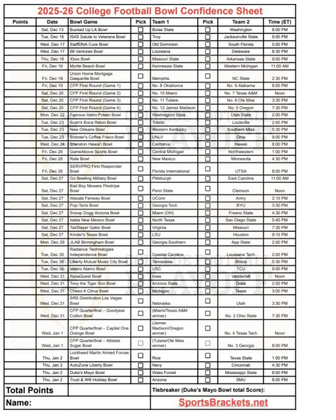 Ecco i nostri fogli di fiducia del College Football Bowl 2025-26 per te. Girone ufficiale CFP bloccato con tutte le 42 partite di bocce + incontri del primo turno. Il Texas fuori dai playoff, affronta il Michigan al Citrus Bowl. La bowl mania è attiva, le critiche sono scottanti (Notre Dame lasciata di nuovo fuori?) e le riserve di fiducia sono dove si trova la vera azione. Ottieni il nostro Kit piscina Bowl Confidence 2025-26 Per dominare il tuo campionato: