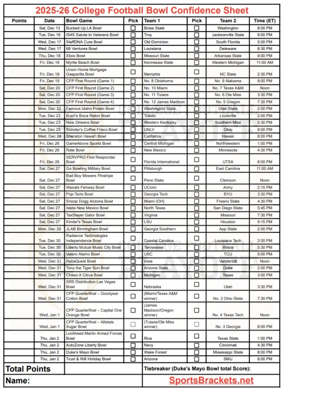 Ecco il foglio di lavoro sulla fiducia del College Football Bowl 2025-26 stampabile (completato). Puoi stamparlo o salvarlo in formato PDF.