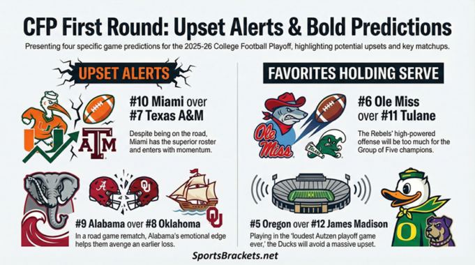 L’ampliamento dei College Football Playoff a 12 squadre inizierà domani con quattro partite del primo turno nel campus. Il vantaggio sul campo di casa è importante, ma le teste di serie inferiori hanno già dimostrato di poter vincere in trasferta nelle partite di bocce. Ecco gli abbinamenti che hanno maggiori probabilità di riservare sorprese, oltre alle nostre scelte dirette e note rapide.