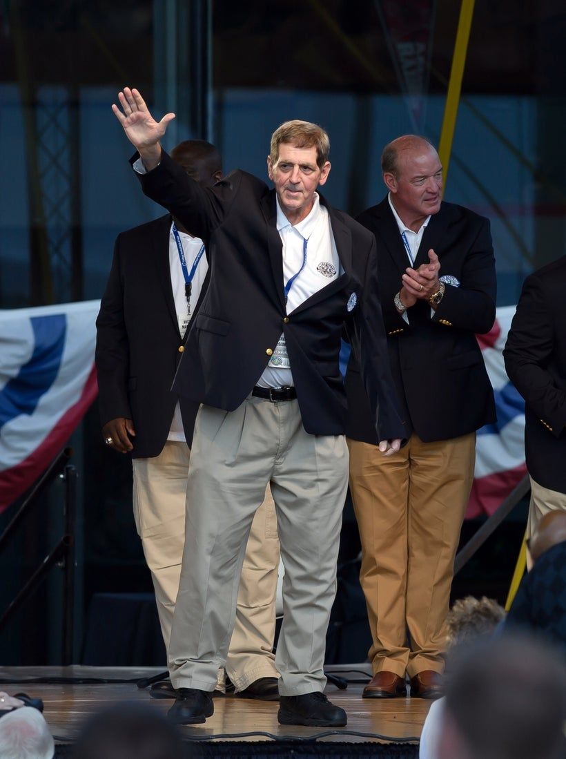 20 luglio 2012; South Bend, IN, Stati Uniti; Richard McGeorge di Elon saluta dopo aver ricevuto il suo blazer alla presentazione del blazer della Hall of Fame del College Football Hall of Fame. Credito obbligatorio: Immagini Matt Cashore-Imagn