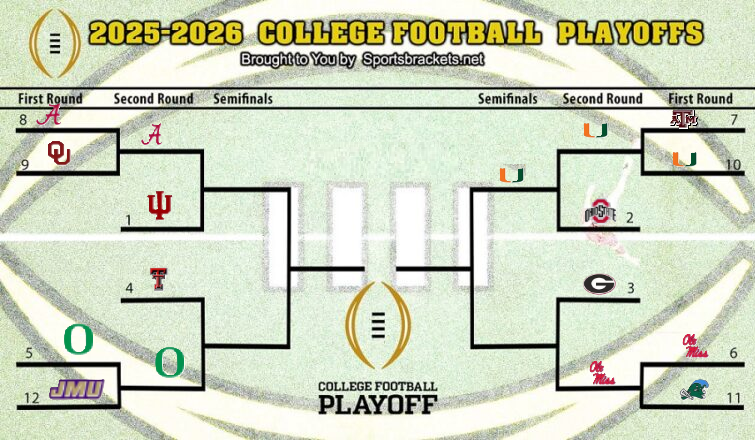 I playoff ampliati continuano a portare drammaticità. Resta sintonizzato su SportsBrackets.net per gli aggiornamenti completi di Capodanno, gli aggiornamenti del tabellone finale del 2 gennaio, i PDF stampabili e le anteprime delle semifinali mentre la strada verso il campionato nazionale a Miami si riscalda! Puoi controllare le probabilità di ogni squadra di battere la nave all’inizio della postseason qui. Abbiamo anche il girone di partenza dei College Football Playoffs in PDF qui per te.