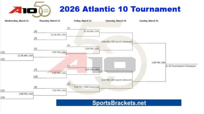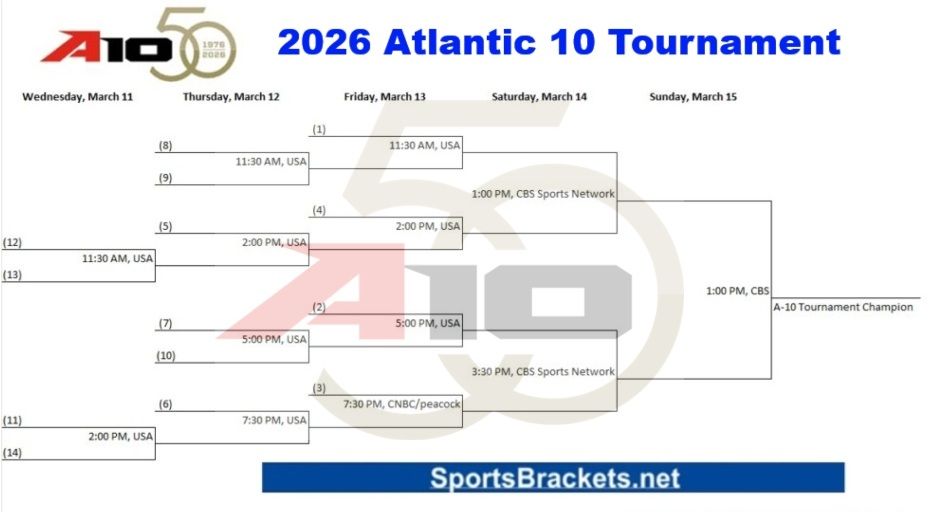Ecco il 2026 Programma del torneo Atlantic 10 per te. Questo è il cinquantesimo anniversario del torneo. Man mano che ci avviciniamo al momento, ti terremo aggiornato sugli ultimi semi, programmi e aggiornamenti sulle trasmissioni TV. *Si prega di notare che tutti gli orari sono soggetti a modifiche/perfezionamento in prossimità dell’orario del torneo.
