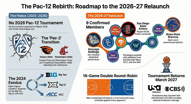 Il Pac-12 è pronto per essere completamente rilanciato Stagione 2026-27 (dal 1 luglio 2026) con nove membri, comprese potenti aggiunte come Gonzaga. Si prevede che un torneo di conferenza riprenderà Marzo 2027 (probabile eliminazione diretta, in onda su USA Network e CBS secondo i recenti accordi con i media). Questa pagina spiega la situazione, elenca le nuove squadre e fornisce risorse ai fan per tenere il passo con la nuova era.