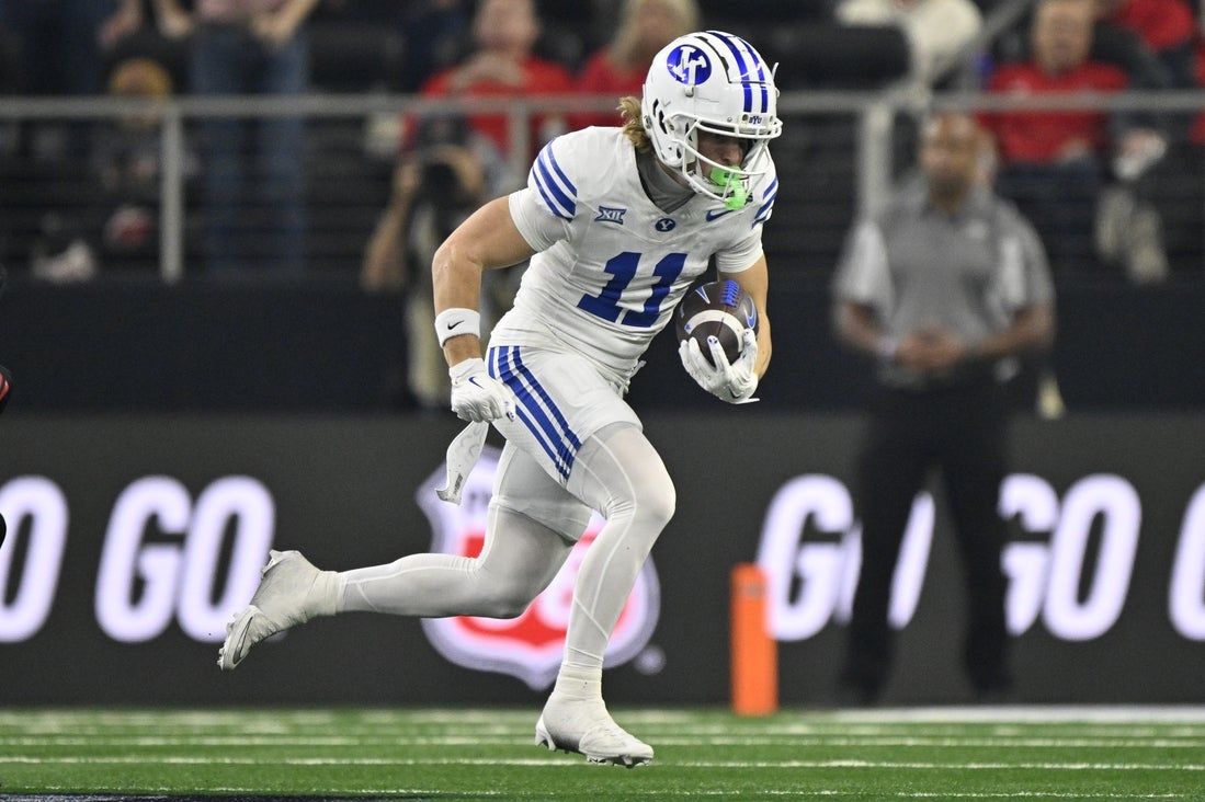 6 dicembre 2025; Arlington, Texas, Stati Uniti; Il ricevitore largo BYU Cougars Parker Kingston (11) corre con la palla durante la prima metà contro i Texas Tech Red Raiders all’AT&T Stadium. Credito obbligatorio: Jerome Miron-Imagn Images