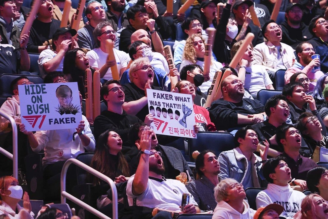 5 novembre 2022; San Francisco, California, Stati Uniti; I fan tengono i cartelli per Lee \”Faker\” Sang-hyeok della corsia centrale T1 (non raffigurato) durante il campionato mondiale di League of Legends contro DRX al Chase Center. Credito obbligatorio: Immagini Kelley L Cox-Imagn