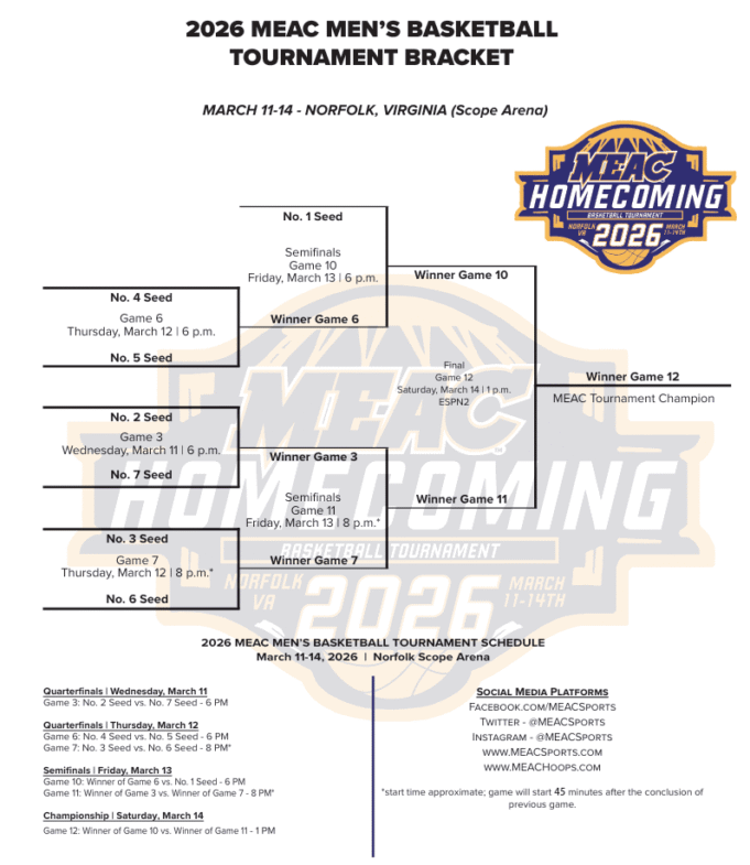 Ecco per te il tabellone stampabile del torneo di basket maschile MEAC 2026. Puoi scaricare e stampare il PDF dal sito web della lega sito web qui.