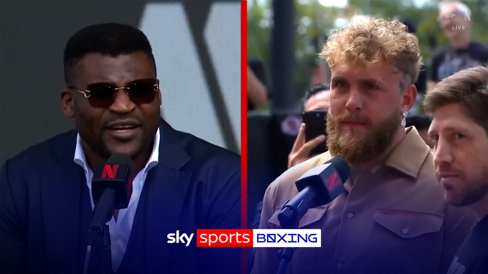 Jake Paul ha provocato un’accesa risposta da parte di Francis Ngannou quando si sono scambiati parole alla conferenza stampa Rousey vs. Carano. Credito: promozioni di maggior valore e Netflix