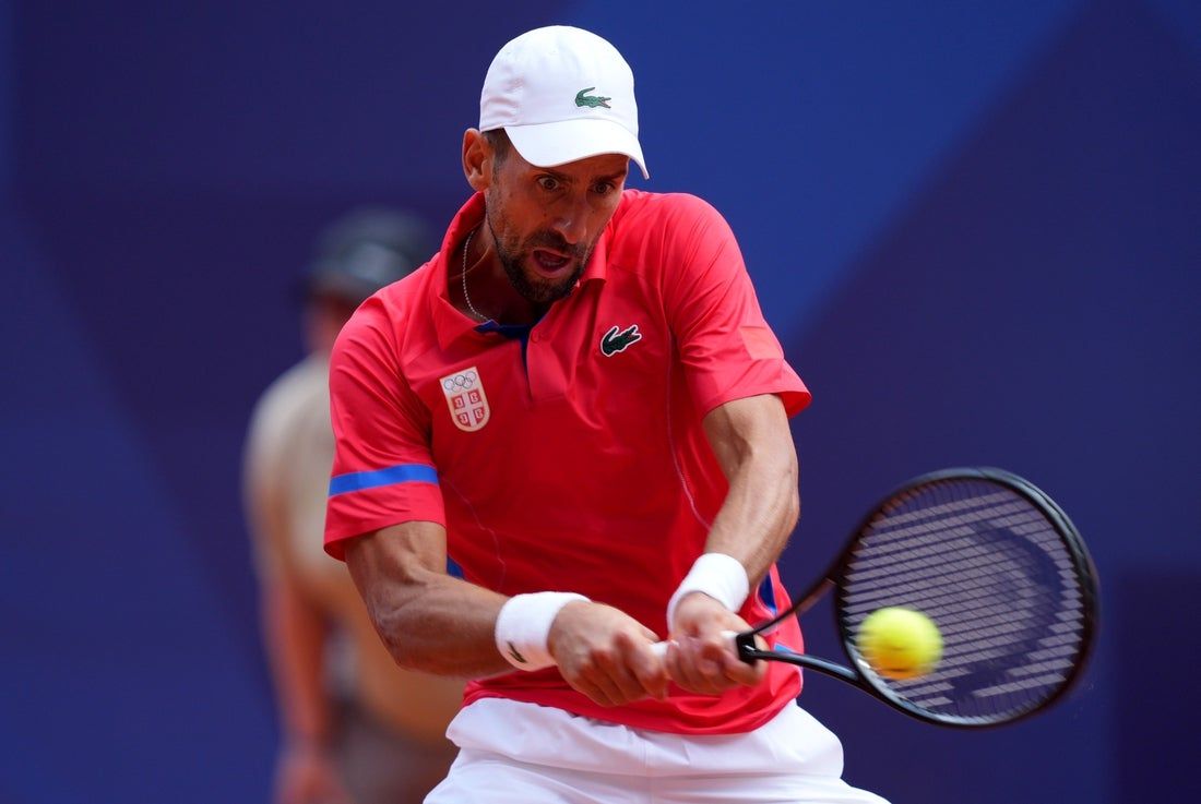 4 agosto 2024; Parigi, Francia; Novak Djokovic (SRB) restituisce un colpo nella partita per la medaglia d’oro del singolo maschile contro Carlos Alcaraz (non raffigurato) durante le Olimpiadi estive di Parigi 2024 allo Stade Roland Garros. Credito obbligatorio: immagini di Amber Searls-Imagn
