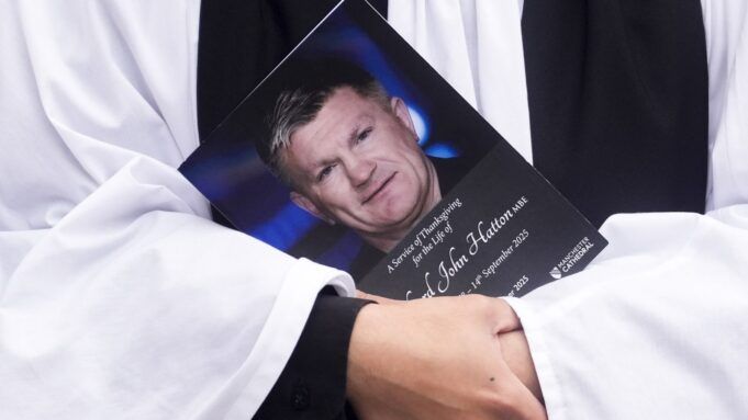 Migliaia di persone in lutto hanno fiancheggiato le strade durante la processione, iniziata al pub locale di Hatton – il Cheshire Cheese a Hyde – alle 9.45 di venerdì, prima di una cerimonia commemorativa privata a partire da mezzogiorno.