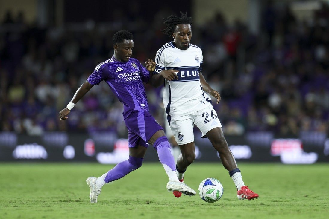 11 ottobre 2025; Orlando, Florida, Stati Uniti; L’attaccante di Orlando City Ivan Angulo (77) e il centrocampista dei Vancouver Whitecaps Jean-Claude Ngando (26) combattono per la palla nella seconda metà all’Inter&Co Stadium. Credito obbligatorio: immagini di Nathan Ray Seebeck-Imagn
