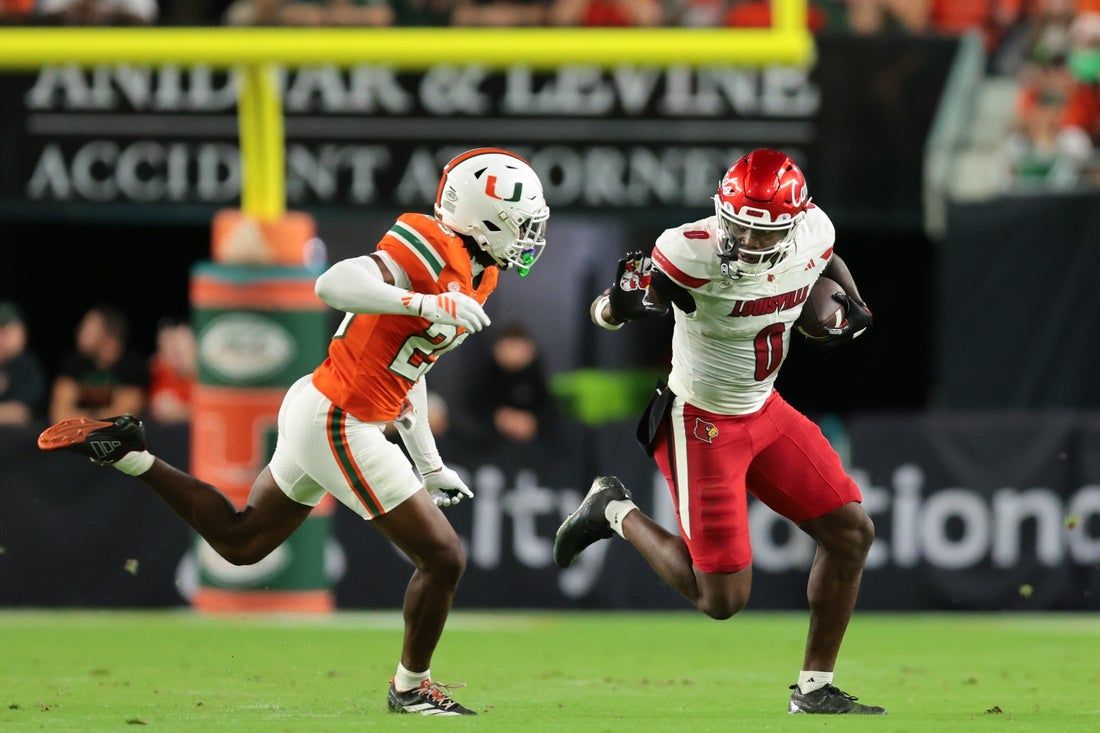 17 ottobre 2025; Giardini di Miami, Florida, Stati Uniti; Il ricevitore largo dei Louisville Cardinals Chris Bell (0) porta la palla contro il difensore dei Miami Hurricanes Jr. Romanas Frederique (29) durante il secondo trimestre all’Hard Rock Stadium. Credito obbligatorio: Immagini di Sam Navarro-Imagn