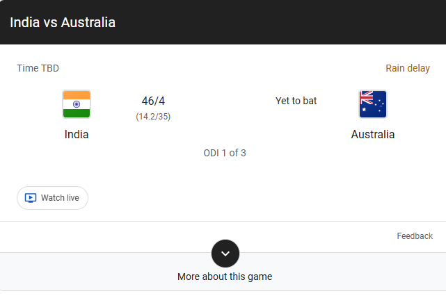Interruzioni per pioggia: Più sospensioni; l’ultima dopo 14.2 overs. Ripresa breve alle 12:20 IST, ma nuovo stop per pioggerellina. Prima partita influenzata dalla pioggia al Perth Stadium dal 2018.
