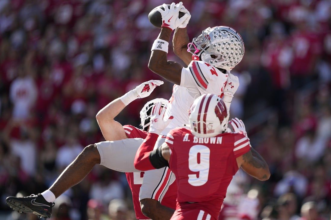 18 ottobre 2025; Madison, Wisconsin, Stati Uniti; Il ricevitore largo dell’Ohio state Buckeyes Carnell Tate (17) effettua una cattura di touchdown contro la sicurezza dei Wisconsin Badgers Austin Brown (9) nel primo quarto al Camp Randall Stadium. Credito obbligatorio: Immagini Jeff Hanisch-Imagn